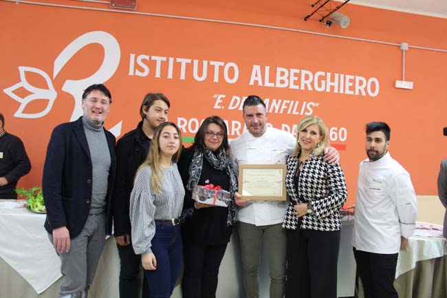 Il primo è stato un omaggio al suo prof di cucina, Claudio Di Battista, tragicamente scomparso un anno e mezzo fa. Presenti nella sala dell’Ipsseoa la moglie del professore, Ersilia, e due dei tre figli, Maria Vittoria e Riccardo.