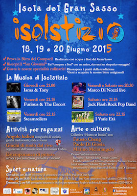 ISOLA DEL GRAN SASSO (TE) – Dal 18 al 20 giugno prossimo a Isola del Gran Sasso tre giornate dedicate a musica, arte, cultura e sport con l’edizione 2015 di Isolstizio. Grande rilievo quest’anno è stato riservato all’arte ed alle sue diverse forme di espressione: da Giovedì fino a Domenica sarà allestita la mostra “Homo ut insula”, una collettiva a cura di Martina Lolli che riunisce tre artisti di Teramo, Fausto Cheng, Paolo Di Giosia e Marino Melarangelo che, sebbene usino differenti media, portano avanti una ricerca artistica affine. Anche quest’anno si celebrerà l’amicizia con il rito del Compare a Fiori, e come da tradizione i rapporti più sinceri potranno essere suggellati con la speciale Birra dei Compari, prodotta con fiori, erbe e acqua del Gran Sasso!