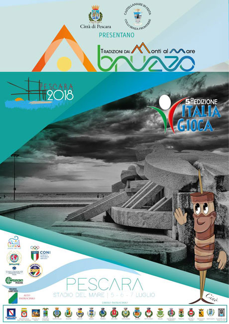 Il tema scelto per Italia Gioca 2018 è “Abruzzo: tradizioni dai monti al mare”. L’evento si svolge allo Stadio del Mare, nel cuore della città, e nella piscina realizzata ai piedi del palco. Largo Mediterraneo ospita anche il “Villaggio delle eccellenze”, con i prodotti enogastronomici e artigianali tipici dell’Abruzzo. Italia Gioca Pescara 2018 ha anche una mascotte – il simpatico Cino, in onore dell’arrosticino, il famoso spiedino di carne ovina – e un inno, “Insieme per la vittoria”, composto da Simone D’Alessandro. Da d’Annunzio a Flaiano, dalla ruzzola alla paranza, dalla raccolta delle olive al matrimonio scannese, dalla conca alle sise delle monache, nel campo di gara vengono celebrati luoghi, personaggi e costumi che esprimono le eccellenze della regione più verde d’Europa.