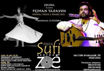 PESCARA – Domenica prossima, 13 ottobre, il CentroZoé, a Pescara, in Via Colle Innamorati 59, propone un evento alla scoperta della cultura Sufi. Doppio appuntamento dal pomeriggio con un Seminario Workshop dalle 16 alle 18.30 presso presso il Centro Artistico Ideàl Strada Degli Oliveti 70, Chieti Scalo dove si andrà alla alla conoscenza pratica della musica e della danza rituale Sufi. La sera invece dalle 20, fino a notte fonda, presso il CentroZoé, Festa Sufi con la performance del maestro Pejman Tadayon, in un percorso di conoscenza della musica, della danza e della cultura Sufi.