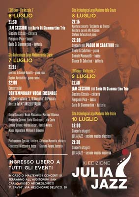 TERAMO – Volge verso la conclusione l’undicesima edizione della rassegna Julia Jazz, organizzata dall’Associazione culturale “Orchestra Contemporanea” ed inserita all’interno del palinsesto culturale della 44a Interamnia World Cup. La rassegna si chiude il 10 Luglio con i concerti di stagisti e docenti dei seminari Julia Jazz 2016. Alle 18:00 si esibirà la sezione di Musica Classica e alle 21:15 la sezione di Musica Moderna.