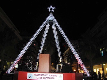 PESCARA- Sistemato nel cuore della città in Piazza Salotto,un albero di Natale tecnologico, alto otto metri,composto da 5mila luci a led: la metà del ‘gemello’ di New York alto 20 metri, con ai piedi un palco in forma esagonale che sino al prossimo 30 dicembre, ospiterà tutti i piccoli eventi che caratterizzeranno il periodo dell’Avvento.
