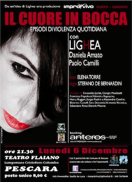 La rassegna di eventi e iniziative promosse dal Centro della Rete Antiviolenza del Comune di Pescara si chiuderà il prossimo 6 dicembre con il concerto di Lighea ‘Il cuore in bocca’ – episodi di violenza quotidiana, alle 21.30, presso il teatro Flaiano il cui incasso verrà devoluto al centro antiviolenza.