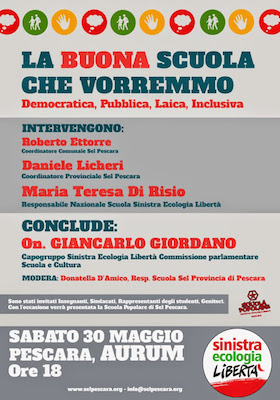 Per tale motivo la Federazione Provinciale di Pescara di Sinistra Ecologia e Libertà ha organizzato un’assemblea pubblica per Sabato 30 Maggio alle ore 18 presso l’ex Aurum a Pescara. All’iniziativa sono stati invitati a partecipare Sindacati, Insegnanti, Rappresentanti degli studenti, Genitori.”