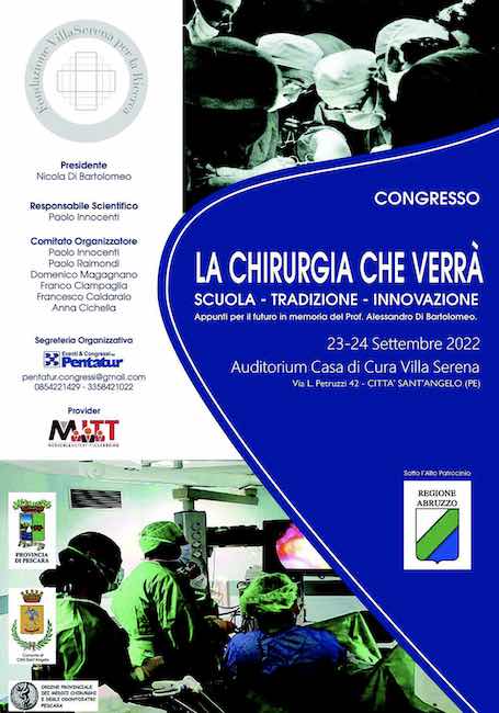 PESCARA – “La Chirurgia che verrà. Scuola, tradizione, innovazione” è il titolo del congresso che si terrà venerdì e sabato prossimi, 23 e 24 settembre, presso l’Auditorium della Casa di Cura Villa Serena, organizzato dal dott. Nicola Di Bartolomeo e dal prof. Paolo Innocenti per ricordare la figura del prof. Alessandro Di Bartolomeo che fu primario a Lanciano, docente all’Università di Chieti e sindaco di Ortona. Molto amato dagli abruzzesi, ha lasciato come eredità una scuola di valenti chirurghi e di ben 8 primari.