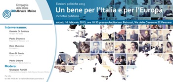PESCARA – Sabato 16 febbraio 2013, alle ore 18.30, presso l’auditorium “Petruzzi” del Museo delle Genti d’Abruzzo, in via delle Caserme a Pescara, si terrà un incontro pubblico promosso dalla Compagnia delle Opere Abruzzo Molise per presentare il documento “Un bene per l’Italia e l’Europa”, proposto a livello nazionale dalla Compagnia delle Opere in vista delle Elezioni Politiche 2013. All’incontro, coordinato da Giuseppe Ranalli, imprenditore e presidente di Cdo Abruzzo Molise, interverranno gli imprenditori Daniele Di Battista (Gruppo Del Gatto), Paolo D’Amico (Reginella d’Abruzzo Srl), Rino Muccino (Emmepi srl), l’operatrice del terzo settore Dora Di Santo (cooperativa Con.Sol.) e Paolo Datore, della Fondazione Santa Caterina, realtà impegnata nel mondo dell’educazione.