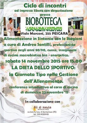 PESCARA – Domani, sabato 14 novembre, alle ore 15, corso gratuito “La dieta dello sportivo – la giornata tipo nella gestione dell’allenamento”, presso la Biobottega, in viale Marconi 225 a Pescara.