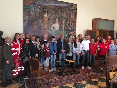 Il sindaco Marco Alessandrini ha accolto il fratello Massimo Sargiacomo e la famiglia che hanno consegnato nelle mani del presidente della Croce Rossa di Pescara Fabio Nieddu un defibrillatore.