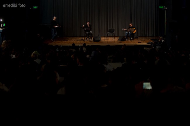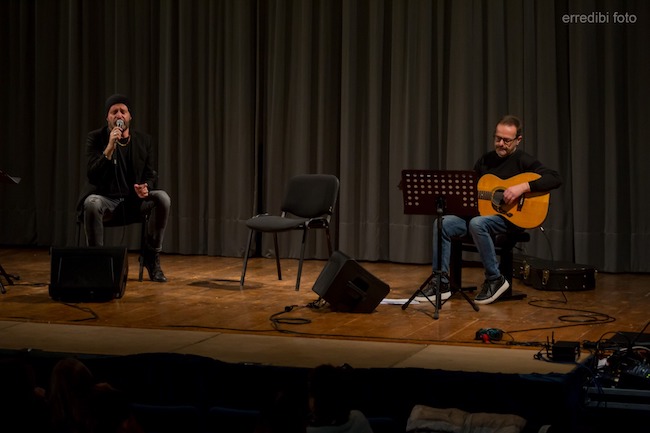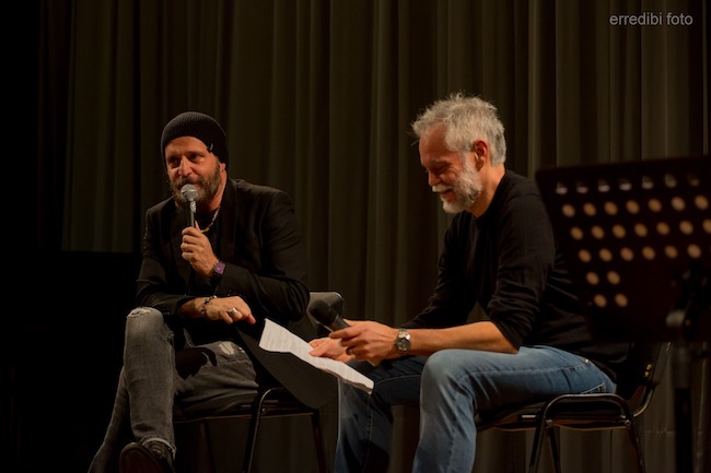 Giò di Tonno: “Questo incontro è l’occasione per raccontare un pochino la mia vita artistica e non anche umana ai ragazzi in questo caso alle scuole medie, della Pascoli e della Michetti ed è anche l’occasione per raccontare un’amicizia. Perché poi le grandi cose almeno dal mio punto di vista e in questo caso spesso nascono proprio dall’amicizia, dalla coesione degli intenti, dalla volontà di portare avanti dei progetti. In questo caso la musica ci ha uniti, l’abbiamo portata avanti e lo facciamo anche con una valenza se vogliamo senza presunzione anche un pò culturale. Io ho fatto e continuo a fare tanto teatro, abbiamo scritto delle cose teatrali insieme oltre le canzoni, diciamo tra virgolette le canzonette e quindi siccome io credo nella valenza anche sociale del teatro, comunicare questo: quanto possa essere importante poi avvicinarsi a questa dimensione qui dove i ragazzi possono trovare anche una fuga della vita di tutti i giorni che spesso non li mette a proprio agio diciamo così. La musica come trait d’union. Io ne ho beneficiato di questo. Sono l’esempio vivente di quanto il teatro, la musica mi abbiano aiutato ad uscire anche dalle difficoltà di una zona. Sono nato e cresciuto a Santa Filomena che negli anni ’70 e ’80 era una zona un pò difficile. Con questo atteggiamento vivo questo appuntamento”.