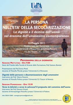 CHIETI – Si svolgerà domani a Chieti Scalo presso l’Auditorium del Rettorato dell’Università degli Studi “G. D’Annunzio” di Chieti-Pescara il convegno “La persona nell’età della secolarizzazione. La dignità e il destino dell’uomo nel dramma dell’umanesimo contemporaneo”. I lavori saranno divisi in due parti, una la mattina alle 9.00 e l’altra il pomeriggio alle 15.30.