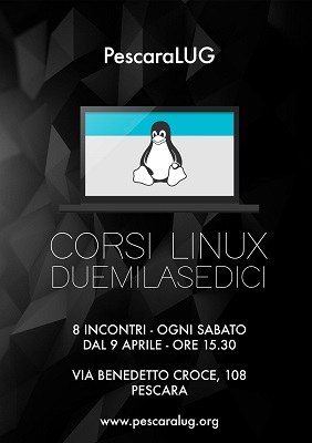 L’associazione PescaraLUG ha ora il piacere di annunciare i corsi di informatica di base che partiranno sabato 9 aprile in via benedetto croce 108, presso la sala conferenze della CGIL, e si susseguiranno per complessive 8 lezioni, sempre di sabato pomeriggio alle ore 15.30. Come di consueto, la partecipazione e libera e gratuita, ed in caso di frequenza assidua sarà consegnato ai partecipanti attestato di frequenza al corso. Verranno sviscerati tutti i temi basilari dell’informatica, dall’architettura interna di un PC all’utilizzo di internet, sempre con un occhio puntato sul software opensource e su Linux come sistema operativo.