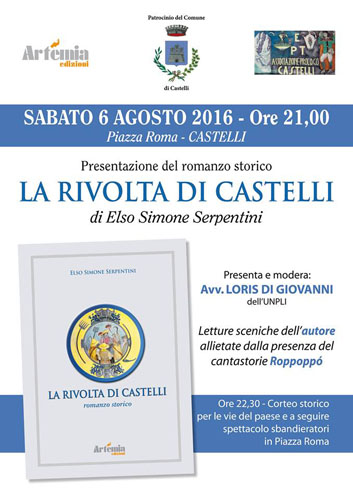 CASTELLI (TE) – Artemia Edizioni con il Patrocinio del Comune di Castelli e la collaborazione della Proloco Castelli presenta Sabato 6 Agosto 2016 alle ore 21.00, presso Piazza Roma di Castelli ,il romanzo storico “La rivolta di Castelli” di Elso Simone Serpentini.