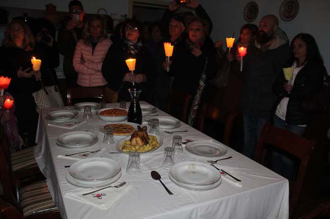 Infine la visita delle abitazioni con le tavole imbandite per la cena accompagnati dal ‘Cantore di Ognissanti’ e dal suono delle zampogne. All’esterno di ogni abitazione l’illustrazione dei simboli, come il sacchetto di grano, la scopa rovesciata, la bacinella, il bastone, e, ogni volta, la scoperta delle ragioni di quelle presenze che affondano le radici nella tradizione abruzzese. Durante la serata è stato possibile rendere omaggio alla Chiesa della Santissima Trinità, situata nel borgo, regolarmente aperta: l’ingresso è stato caratterizzato dalla presenza di un ‘Pulcinella abruzzese’, quale trait d’union tra il mondo dei vivi e quello dei morti, e, secondo le antiche credenze, il primo che è entrato ha liberato un’anima del Purgatorio.