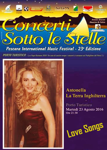Ora, in vista del ‘Pescara International Music Festival’ per il quale ha tentato il coinvolgimento di una big band capitolina, la cantante Antonella La Terra Inghilterra, che nel suo curriculum annovera esecuzioni per i Premi Oscar quali Bacalov e Morricone, ha deciso di offrire al pubblico estivo di Pescara un’altra originale serata di concerto ‘Love Songs’ facendosi accompagnare da altrettanti illustri maestri della musica: Paolo Catone al piano, Daniele Fratini alla chitarra, Pier Paolo Tolloso e Simone Blasioli al sax, Francesco Santopinto alle percussioni, Gregory Coniglio al contrabbasso e Marcella Quintili voce-soprano.