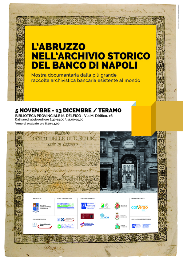 L’Associazione Culturale ConVerso organizza la mostra: “A Teramo, abbiamo scelto la Biblioteca M. Dèlfico per avvicinare il pubblico dei più giovani, degli studenti di tutte le età. Scopo della mostra è quello di promuovere l’Archivio Storico dell’Istituto Banco di Napoli – Fondazione nei confronti di studenti, storici, ricercatori e di tutti coloro che vogliono scoprire, attraverso i documenti, le interessanti vicende che hanno riguardato l’Abruzzo nel passato”, afferma la presidente Anna Ricciutelli.
