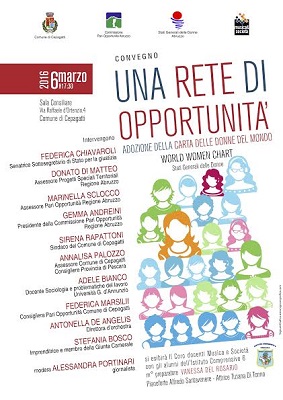 CEPAGATTI (PE) – L’Amministrazione Comunale di Cepagatti, guidata dal sindaco Sirena Rapattoni, adotta la Carta delle donne del mondo (Wolrd Women Chart), quale dichiarazione di intenti per contribuire alla diffusione delle politiche di parità e pari opportunità e di una cultura libera da discriminazioni e pregiudizi. L’impegno a promuoverne i valori sarà preso nel corso di “Una rete di opportunità”, convegno che si terrà domenica prossima, 6 marzo, alle 17.30, nella sala consiliare del Comune.