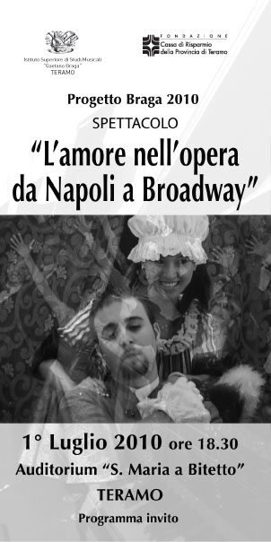 Organizzato dall’Istituto Superiore di Studi Musicali Gaetano Braga di Teramo nell’ambito del Progetto Braga 2010, contenitore finanziato dalla Fondazione Cassa di Risparmio, lo spettacolo operistico nasce dalla collaborazione tra la classe di Canto del M° Gianluca Moschetti, della Prof.ssa Sofia Cavarocchi in qualità di accompagnatore al pianoforte e del M° Manolo Di Liberatore per il Jazz, la classe di Arte scenica della Prof.ssa Edvige Giusto, e la classe di Letteratura poetica e drammatica della Prof.ssa Antonietta Cerocchi.