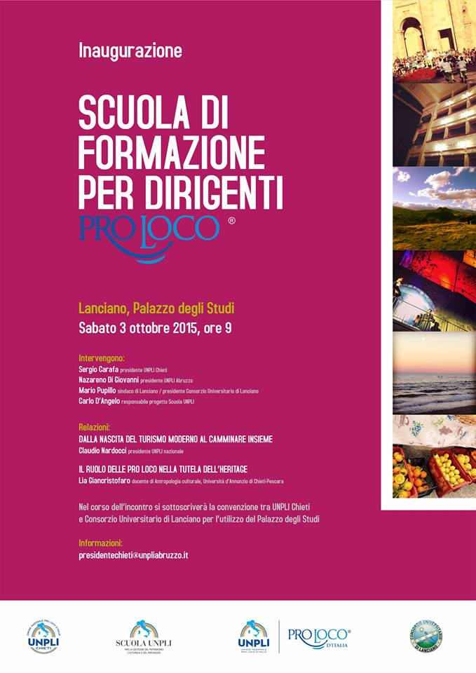 LANCIANO (CH) – Partirà oggi sabato 3 ottobre alle ore 9 a Lanciano, presso il Palazzo degli Studi, il primo corso di formazione per dirigenti Pro Loco promosso dal Comitato Provinciale UNPLI Chieti e dalla neonata Scuola UNPLI.
