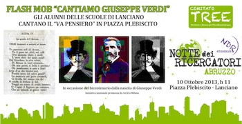 LANCIANO(CH) – I bambini e i ragazzi delle scuole dell’Istituto Comprensivo “D. G’Annunzio” di Lanciano aderiscono alla ricorrenza per il bicentenario di Giuseppe Verdi con un “flash mob” in programma giovedì 10 ottobre alle ore 11 in piazza Plebiscito.Un’iniziativa organizzata dal Comitato TREE (Territorio e Ricerca per l’Eccellenza europea) e inserita nell’ambito del “Viaggio verso la Notte dei Ricercatori Abruzzo”, iniziato il 13 settembre scorso con l’evento presso l’Officina storica Sangritana, e che vivrà l’evento ‘clou’ venerdì 11 ottobre con il “Viaggio oltre la Notte” (spettacoli, concerti, degustazioni e non convegno).Credendo che è proprio a partire dalle giovani generazioni che si può effettivamente creare una nuova cultura della ricerca e dell’innovazione, il Comitato TREE accoglie l’iniziativa promossa a livello nazionale da AsLiCo, Associazione Lirica e Concertistica con sede a Milano.