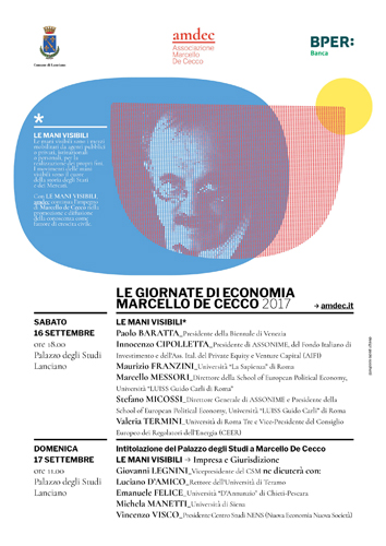 Nella prima delle giornate dell’economia che l’Associazione che porta il suo nome promuove a Lanciano sabato 16 e domenica 17 settembre, delle “mani visibili” che agiscono nei mercati parleranno gli economisti Paolo Baratta (Presidente Biennale di Venezia), Enzo Cipolletta (Presidente Assonime, del Fondo Italiano di Investimento e dell’associazione italiana del Private Equity e Venture Capital – Aifi), Maurizio Franzini (Università La Sapienza di Roma), Marcello Messori (Direttore School of European Political Economy, Università Luiss Guido Carli di Roma), Stefano Micossi (Direttore Generale Assonime, Presidente School of European Political Economy, Università Luiss Guido Carli di Roma) e Valeria Termini (Università Roma tre e Vice presidente del Consiglio Europeo dei Regolatori dell’Energia – CER) dalle 18 a Palazzo degli Studi.