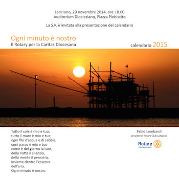 LANCIANO (CH) – Sabato 29 novembre 2014,alle ore 18.00,presso l’ Auditorium Diocleziano,in Piazza Plebiscito a Lanciano si terrà la presentazione del Calendario Rotary 2015: “Ogni minuto è nostro”.