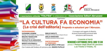 LANCIANO (CH) – L’Associazione culturale ITALFIDA, in collaborazione con l’ASSOCIAZIONE EDITORI ABRUZZESI, organizza per venerdì, 4 ottobre 2013, alle ore 17.30, presso il Palazzo degli Studi in Corso Trento e Trieste n. 72, a Lanciano il Convegno dal titolo: LA CULTURA FA ECONOMIA (La crisi dell’editoria). Proposte e soluzioni per l’Abruzzo.