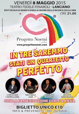 LANCIANO (CH) – Venerdì 8 maggio alle ore 21 al teatro Fenaroli va in scena “IN TRE SAREMMO STATI UN QUARTETTO PERFETTO”, spettacolo teatrale di beneficenza a favore della Onlus “Progetto Noemi”.