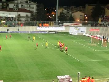 Il Verona preme sull’acceleratore e poco dopo la mezzora perviene al vantaggio: Rosania scivola, Martinho si trova un’autostrada davanti e si invola trafiggendo un incolpevole Leali. Arriva anche l’infortunio di Vastola a complicare i piani di Gautieri (entra Di Cecco), ma i frentani reagiscono alla grande. Al 40′ Turchi offre un invitante pallone a Piccolo che non si fa pregare sferrando un bolide che si insacca sul palo lontano: è il gol del pareggio. Il giocatore si toglie la maglia per una dedica tutta speciale: sotto ha infatti un’altra maglia raffigurante lo sfortunato Piermario Morosini, bel gesto, ma purtroppo arriva l’inevitabile ammonizione da parte del direttore di gara. Il primo tempo si chiude dunque sull’1-1.