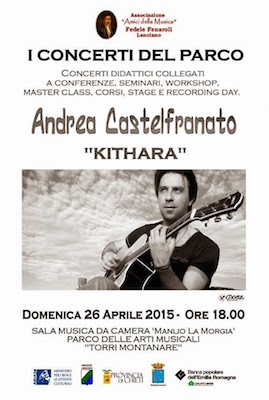 Questo appuntamento del mese di aprile con la chitarra del virtuoso Andrea Castelfranato è il primo dei tre WORKSHOP SPECIALI e CONCERTI, organizzati dall’Associazione “Amici della Musica FEDELE FENAROLI” in collaborazione con Pixie Promotion, inseriti all’interno della rassegna di eventi didattici e concertistici “I CONCERTI DEL PARCO” dell’Estate Musicale Frentana 2015.