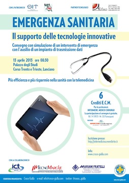 LANCIANO (CH) – Sabato 13 aprile 2013 dalle ore 8.30 si svolgerà a Lanciano, presso il Palazzo degli Studi in Corso Trento e Trieste, il convegno “Emergenza Sanitaria, il supporto delle tecnologie innovative” ,organizzato dalla Croce Gialla in collaborazione con la Società Italiana di Telemedicina e con la Società Italiana Sistema 118 che hanno la responsabilità scientifica dell’evento.