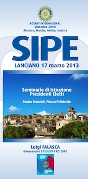 LANCIANO (CH) – Oggi, 17 marzo 2013, alle ore 9.00, presso il teatro Fenaroli di Lanciano si terrà il Seminario di Istruzione dei Presidenti Eletti (SIPE) organizzato dal Distretto 2090 del Rotary International (Abruzzo, Marche Molise ed Umbria). Si celebrerà nella città frentana il primo dei tre importanti appuntamenti rotariani dell’annata 2013/2014, dedicato alla presentazione della linee guida del Rotary International secondo le direttive del Presidente Internazionale, l’americano Ron D. BURTON, ed all’istruzione dei Presidenti di Club.