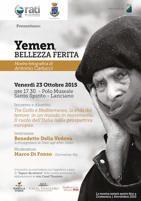 L’incontro,moderato dal giornalista Sky Tg24 Marco Di Fonzo, si svolgerà in occasione dell’inaugurazione della mostra fotografica “Yemen, bellezza ferita”, del prof. Antonio Carlucci (aperta fino a domenica 1 novembre).