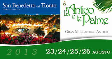SAN BENEDETTO DEL TRONTO – Torna l’ultimo appuntamento per questa stagione estiva de L’antico e le Palme, la rassegna di antiquariato più importante dell’estate italiana sull’isola pedonale di San Benedetto del Tronto dal 23 al 26 agosto 2013.L’Antico e le Palme è un luogo conosciuto in tutt’Italia per la qualità che ha sempre offerto e continua ad offrire al vasto pubblico di appassionati e curiosi. L’edizione di giugno ha registrato una straordinaria partecipazione del pubblico non solo locale e dell’intera regione ma di un turismo a livello nazionale, che è stato sorpreso dalle tante occasioni che la mostra ha proposto come arredamenti vintage di firma, collezionismo cartaceo marchigiano e non, mobili e quadri di alto antiquariato.