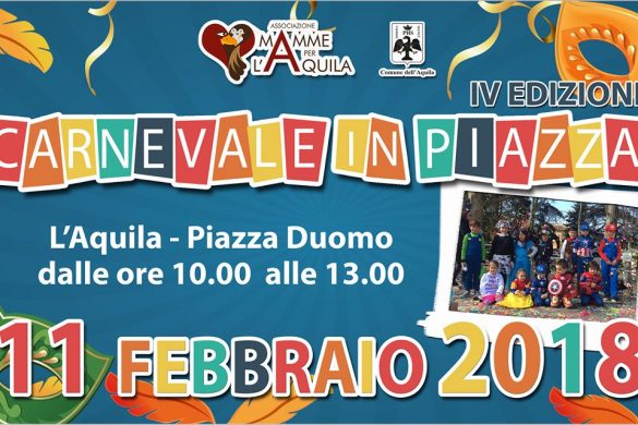 Domenica 11 febbraio torna il “Carnevale in piazza”, che si terrà a Piazza Duomo dalle ore 10 alle 13, organizzato dall’Associazione “Mamme per L’Aquila”. Ad intrattenere i bambini ci saranno le mascotte e i personaggi più amati del mondo fantasy. Non mancheranno momenti di attrazione anche per gli adolescenti e i più grandi, con la musica di DJ Carosone.