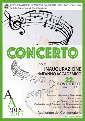L’AQUILA – Domani, martedì 22 novembre 2016, alle ore 11.30 il Conservatorio “Alfredo Casella” inaugurerà l’Anno accademico 2016/2017 con un grande concerto sinfonico.