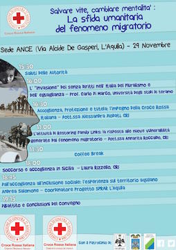 L’AQUILA -“Salvare vite, cambiare mentalità: la sfida umanitaria del fenomeno migratorio” è il titolo del Convegno che si terrà a L’Aquila, sabato 29 novembre 2014 , presso la sede ANCE ,in Via Alcide De Gasperi.In occasione dei 150 anni dalla Fondazione della Croce Rossa Italiana e dalla firma della Prima Convenzione di Ginevra,nella nostra Regione, il Comitato Regionale Abruzzo in collaborazione con il Comitato Locale de L’Aquila della Croce Rossa Italiana organizza tale convegno incentrato sul fenomeno delle migrazioni, tematica assolutamente attuale che rappresenta un’importante sfida umanitaria anche sul nostro territorio.Cambiare mentalità, accettare l’altro come ricchezza e non come minaccia nella consapevolezza che nessun essere umano debba essere considerato illegale è l’obiettivo che questo convegno si pone di promuovere tra tutta la popolazione.