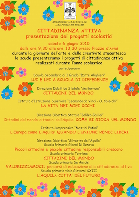 “Abbiamo avviato con le scuole dell’Aquila un percorso improntato sulla necessità di incentivare la riflessione su alcuni temi formativi, come i diritti di cittadinanza e l’integrazione. Un percorso, che giunge a conclusione il 6 giugno, con la presentazione dei progetti alla città- ha dichiarato Emanuela Di Giovambattista- Quest’anno abbiamo chiesto alla Consulta degli Studenti di arricchire la loro giornata con i progetti realizzati dalle scuole di ogni ordine e grado”.
