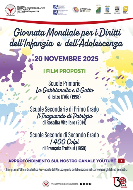 L’AQUILA – L’Istituto Cinematografico dell’Aquila “La Lanterna Magica” ETS propone per le scuole due giornate per riflettere sull’importanza di due valori inviolabili sui cui si basa la dignità umana, Diritti e Rispetto, nell’ambito delle celebrazioni della Giornata mondiale per i diritti dell’infanzia e dell’adolescenza e Giornata Internazionale contro la violenza sulle donne.