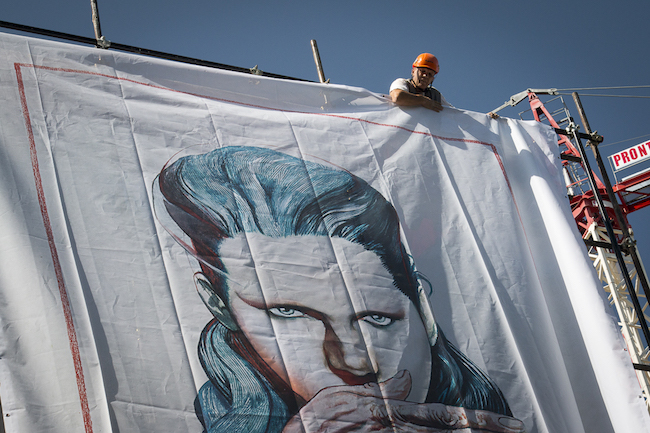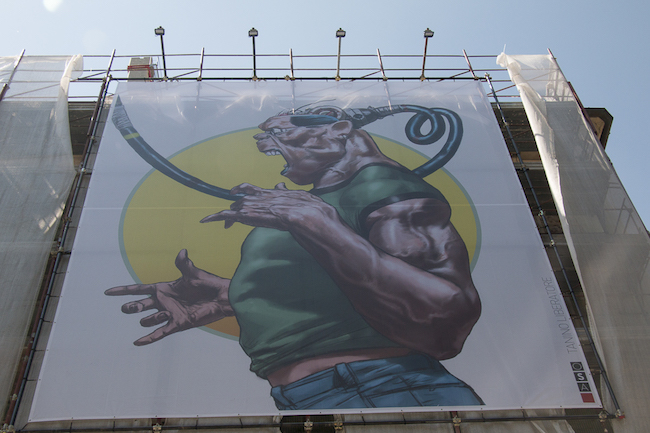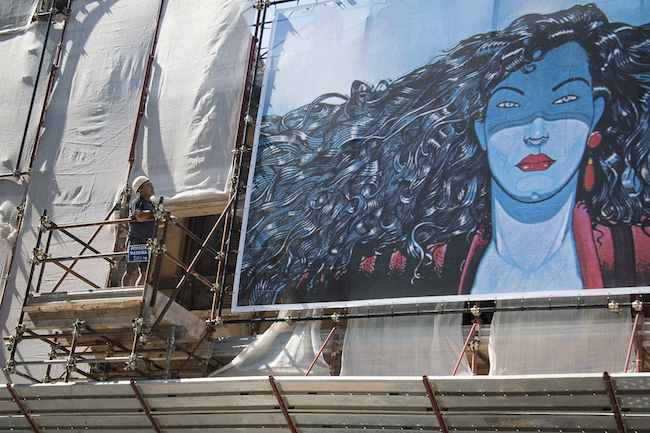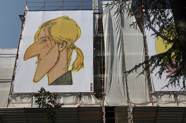 L’AQUILA – Venerdì 6 luglio sui ponteggi dell’Impresa di Costruzioni Generali Ingg. Frezza spa (via Castello) Off Site Art ha installato quattro opere grandi fino a 9 metri e firmate da due giganti del fumetto: Andrea Pazienza e Tanino Liberatore. L’iniziativa fa parte di “Due a Due”, un ciclo di installazioni site specific frutto della collaborazione tra due illustratori o fumettisti italiani e parte del progetto di arte pubblica che dal 2014 accompagna la ricostruzione della città con delle immagini d’artista sui ponteggi degli edifici danneggiati dal terremoto del 2009.