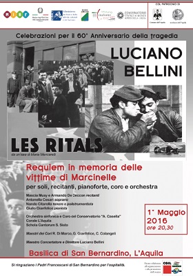 L’AQUILA – Domenica 1° maggio alle ore 20.30 presso Basilica di San Bernardino a L’Aquila, l’Orchestra del Conservatorio “Alfredo Casella” eseguirà Les Ritals, Requiem per soli, voci recitanti, pianoforte, coro e orchestra composto da Luciano Bellini in memoria delle vittime di Marcinelle, un’opera che verrà riproposta in una versione inedita in occasione delle celebrazioni per il 60° anniversario della tragedia, avvenuta l’8 agosto del 1956 nella cittadina belga della regione del Charleroi, e in cui morirono 262 persone, 136 italiani dei quali più della metà abruzzesi.