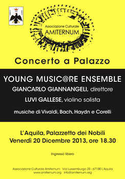 Venerdì 20 Dicembre. L’appuntamento con Young Music@re Ensemble del M° Giancarlo Giannangeli sarà un’occasione per conoscere una vera orchestra d’archi formata da giovanissimi allievi delle scuole medie aquilane, attiva dallo scorso anno. Il coinvolgimento di questo gruppo strumentale nel cartellone “Concerto a Palazzo” è stato voluto fortemente dall’Associazione Amiternum con l’intento di dedicare la dovuto attenzione all’attuale aspetto pedagogico della musica, di importanza fondamentale per la crescita di un ragazzo, fin dalla tenera età.
