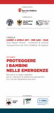 L’AQUILA – Lunedì , 4 aprile, dalle ore 9.00 alle 13.30 si terrà presso l’Aula Magna “Rivera” – Università dell’Aquila,Tensostruttura del Polo Didattico di Coppito, il Convegno dal titolo “Proteggere i bambini nelle emergenze”, Strumenti e modelli operativi per gli interventi di protezione dei bambini alla luce dell’esperienza aquilana.