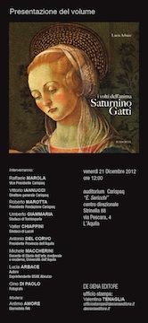 L’AQUILA – Venerdì 21 dicembre 2012 , alle ore 12.00, presso l’Auditorium Carispaq, Centro direzionale “Strinella 88” in Via Pescara, 4 a L’Aquila,verrà presentato il libro dedicato al genio artistico di Saturnino Gatti, protagonista del Rinascimento e di luoghi straordinari d’Abruzzo.