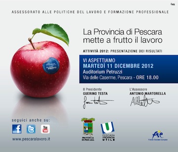 PESCARA – Martedì prossimo,11 dicembre, alle ore 18, nella sala “Auditorium Petruzzi” di via delle Caserme, a Pescara, si svolgerà un evento promosso dall’Assessore provinciale al Lavoro e Formazione Antonio Martorella, per presentare il consuntivo sulle attività adottate e finanziate con i fondi europei 2009-2010-2011 nell’anno solare 2012 e le prime proposte operative per il 2013.