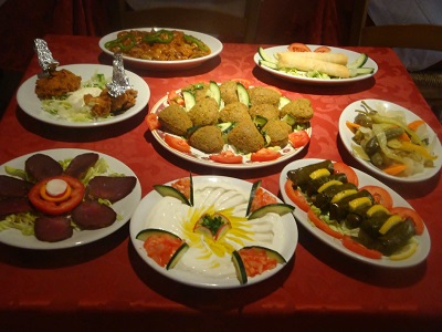 Ecco il menu della serata: tipico della cucina libanese è il “Mezze”, che è assimilabile alle tapas spagnole, un vero e proprio antipasto misto. Quest’ultimo comprende: “Humus”, crema di ceci, succo di limone e tahina; “Falafel”, ceci, cipolla, prezzemolo, spezie speciali; “Prosted”, ali di pollo; “Burak bel Jebeneh”, pastasfoglia ripiena di formaggio; “Mugiadara”, lenticchie, grano duro, olio d’oliva, cipolla; “Warak Inab”, farcitura di riso, prezzemolo, pomodoro, cipolla e menta. Come secondo, tre piatti: “Kafta Halabi”, spiedini di carne di vitella tritata, prezzemolo, cipolla; “Shish Taulk”, spiedini di pollo marinato; “Kebeh”, impasto di carne di vitella con grano duro, ripieno di carne di vitella, cipolla e pinoli. A conclusione, il dessert siriano libanese dello chef.