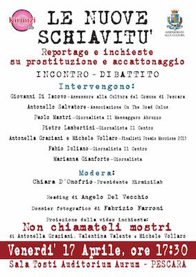 PESCARA – Venerdì prossimo, 17 aprile alle ore 17.30, presso la SalaTosti dell’Auditorium Aurum di Pescara, si terrà un incontro dal titolo Le Nuove Schiavitù – Reportage e Inchieste su Prostituzione ed Accattonaggio, organizzato dall’associazione culturale KirmiziLab e patrocinato dall’assessorato alla Cultura del Comune di Pescara. Tra i temi che verranno toccati ci sarà la tratta degli essere umani nei fenomeni della prostituzione e dell’accattonaggio, raccontata da web-inchieste, servizi di carta stampata, reportage fotografici e approfondimenti giornalistici.