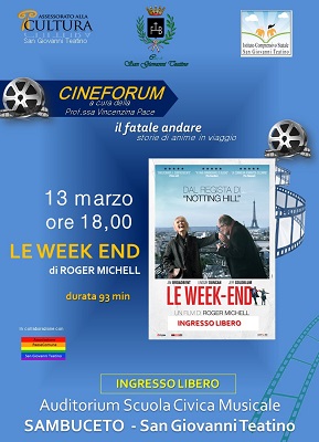 SAMBUCETO (CH) – Il magnifico ritratto di una matura coppia di insegnanti inglesi che trascorrono un weekend a Parigi. “Le week-end” di Roger Michell: ancora una proiezione di qualità al Cineforum di San Giovanni Teatino che nasce dalla collaborazione tra amministrazione comunale (assessorato alla cultura) e Istituto Comprensivo “G. Galilei”. É la seconda proposta della curatrice Vincenzina Pace che quest’anno ha scelto come filo conduttore “Il fatale andare. Storie di anime in viaggio”.