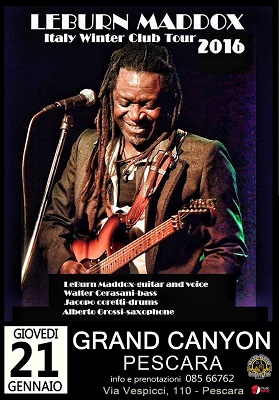 PESCARA – Giovedì prossimo, 21 gennaio alle ore 21, sul palco del Grand Canyon di Pescara, concerto di Leburn Maddox, chitarrista di James Brown. Il noto cantante e chitarrista, direttamente dagli Usa, accenderà il palco di via A. Vespucci, scelto come tappa dell’Italy Winter Club Tour 2016, accompagnato da Walter Cesarani al basso, Jacopo Coretti alla batteria e Alberto Grossi al sassofono.