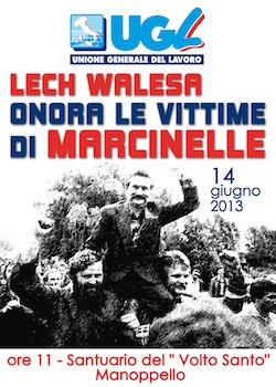 Per il Segretario Confederale UGL Geremia Mancini: “ Si tratta di un evento unico, il grande e coraggioso leader di “Solidarnosc” che si reca ad onorare i Caduti di Marcinelle rappresenta una tappa storica per il Mondo del Lavoro.La visita del più grande sindacalista vivente a Manoppello (il paese che pagò il maggior tributo in vite umane nella tragedia dell’8 agosto 1956) è un gesto, di grande sensibilità ed umanità, che rimarrà nella storia del movimento operaio. Lech Walesa testimonia così la necessità del Ricordo, della Memoria e soprattutto del Rispetto verso chi per il riscatto della propria terra e delle proprie famiglie seppe affrontare il duro lavoro delle miniere fino all’estremo sacrificio. A Lech Walesa sarà consegnata la “Lampada del minatore” riconoscimento che va a chi “con il proprio impegno ha saputo servire lo spirito dei minatori di Marcinelle”. Importante, infine, l’incontro, da noi promosso e voluto, con l’intero mondo del Lavoro Abruzzese quando Lech Walesa incontrerà le delegazioni di CGIL, CISL, UIL e naturalmente UGL guidate dai segretari regionali delle organizzazioni sindacali.”