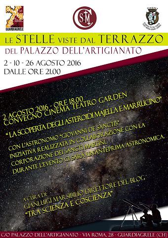 GUARDIAGRELE (CH) – L’Ente Mostra dell’Artigianato Artistico Abruzzese alza lo sguardo verso il cielo: nelle serate di agosto ci saranno tre appuntamenti dedicati all’osservazione astronomica. Gli incontri sono iniziati il 2 agosto, dopo il convegno dedicato alla “Scoperta degli asteroidi Majella e Marruccino”: relatore sarà Giovanni De Sanctis, astronomo di base all’osservatorio di Torino e scopritore di oltre 40 asteroidi e pianetini.